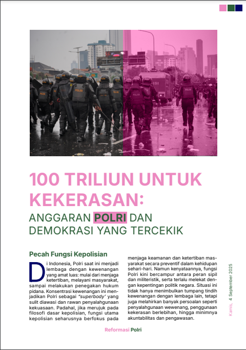 Pada APBN 2025, anggaran Polri mencapai lebih dari Rp100 triliun, menjadi salah satu lembaga dengan anggaran tertinggi di Indonesia. Besarnya anggaran lembaga kepolisian ini tentu saja perlu ditelaah lebih jauh dan dibongkar transparansinya. Semisal, menurut laporan Indonesia Corruption Watch (ICW) per Februari 2024, Polri telah menghabiskan anggaran sekitar Rp188,0 miliar untuk pembelian gas air mata dan perlengkapannya.