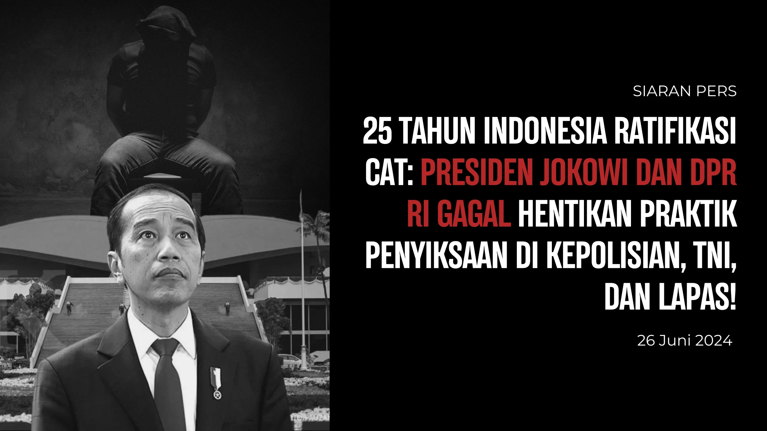 26 Juni 2024 – Tanggal 26 Juni merupakan momentum penting bagi komunitas internasional dalam memperingati hari anti penyiksaan. Peringatan ini berawal dari terbentuknya Konvensi Menentang Penyiksaan dan Perlakuan atau Hukuman lain yang Kejam, Tidak Manusiawi atau Merendahkan Martabat Manusia (Convention Against Torture/CAT) yang mulai diberlakukan tanggal 26 Juni 1987 bagi seluruh negara anggota. Berlakunya Konvensi CAT menjadi instrumen utama dalam perjuangan mencegah praktik penyiksaan dan penghormatan martabat manusia.